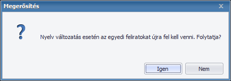 Amennyiben egyedi, tehát a felhasználó által kézzel megadott feliratok is szerepelnek az etiketten és így váltunk nyelvet, a program figyelmeztető üzenetet ad arra vonatkozóan, hogy az egyedi feliratok szövegezését kézzel kell módosítanunk.