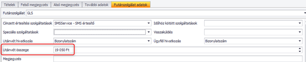 Amennyiben utánvétes fizetési mód van megjelölve a bizonylaton, az utánvét összeg megjelenik a futárszolgálati adatok között a bizonylat végösszegével. Ez az adat mentés előtt módosítható.