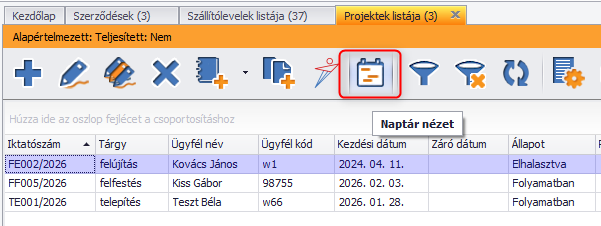 - Projekt lista – Naptár nézet