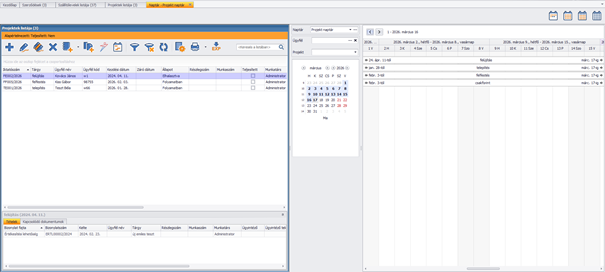 Mindkét rész kezelhető, tehát szűrhetünk benne, szerkeszthetjük az adatokat. A naptárat lekérhetjük éves, negyedéves, heti, vagy havi nézetre, de egyedi időintervallumot is megadhatunk. Szűrhetünk külön ügyfélre, lekérhetjük a listát a teljesített és a még teljesítetlen projektekre, illetve (ha vannak), a rögzített naptárakat is szűrhetjük. A nézet „felezővonala” manuálisan mozgatható, attól függően, melyik részből szeretnénk többet látni.