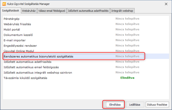 A szolgáltatást ellenőrizhetjük, ha a szervergépen megnyitjuk a KS Szolgáltatás Managert. Amennyiben nem fut, vagy nincs telepítve, jelöljük ki és kattintsunk az Elindítás gombra.