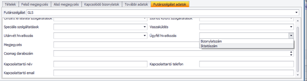 Van lehetőség ügyfél hivatkozás feltöltésére is. Ez az adat a Bizonylatszám, vagy az Iktatószám lehet. Alapértelmezetten is be tudjuk állítani a Rendszer beállítások/Futárszolgálat beállítások menüpontban.