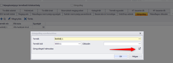 A göngyölegek kezelését kiegészítettük úgy, hogy amennyiben importálni szeretnénk egy göngyöleges terméket, a hozzá beállított göngyöleg megkaphatja a „Göngyölegek halmozása” jelölőt, csakúgy, mint manuális rögzítés esetében.