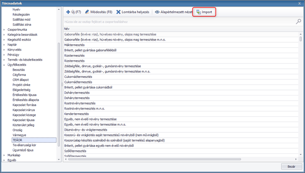 A továbbiakban lehetőség van a TEÁOR kódok importálására. Ehhez lépjünk be a Karbantartás/Törzsadatok/Ügyfélkezelés/TEÁOR menübe és használjuk az Import lehetőséget.