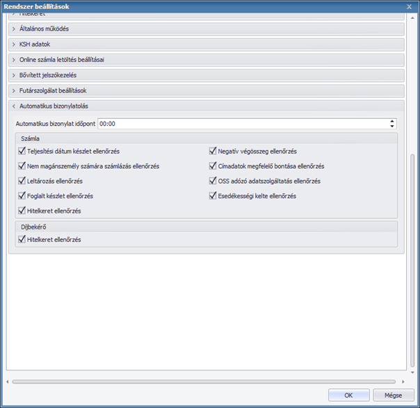 Beállíthatjuk azt is, hogy a számla kiállítása során mit ellenőrizzen a rendszer. Ezeket a Karbantartás/Rendszer beállítások/Automatikus számlázás menü alatt tehetjük meg.