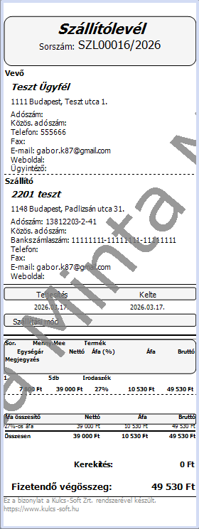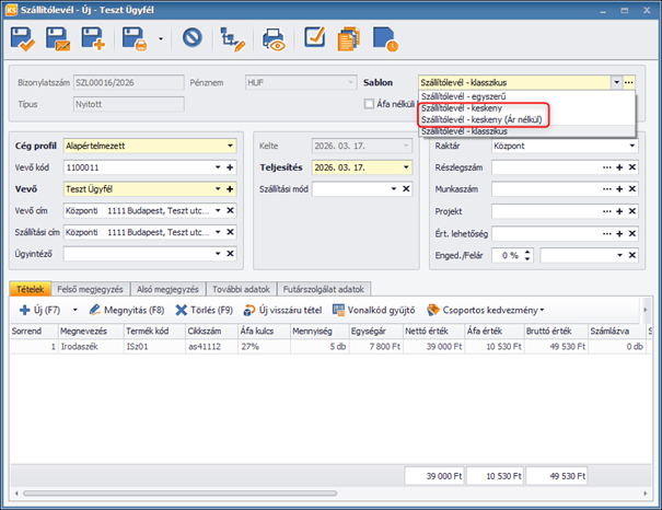 Ha keskeny sablont szeretnénk használni nyomtatás során, a megszokott módon válasszuk ki a listából, majd küldjük el a bizonylatot nyomtatásra például egy blokknyomtatóra.