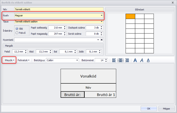 A továbbiakban lehetőség van arra is, hogy etikett készítése során megadjuk, milyen nyelven szeretnénk szerepeltetni a feliratokat. Fontos tudni, hogy ez az alapértelmezett feliratokra vonatkozik, amiket a program magyarul tárol, mint például a nettó ár, bruttó ár, mennyiségi egység, tehát azok, amelyek az etikett szerkesztő ablakban a Mezők alatt találhatóak.