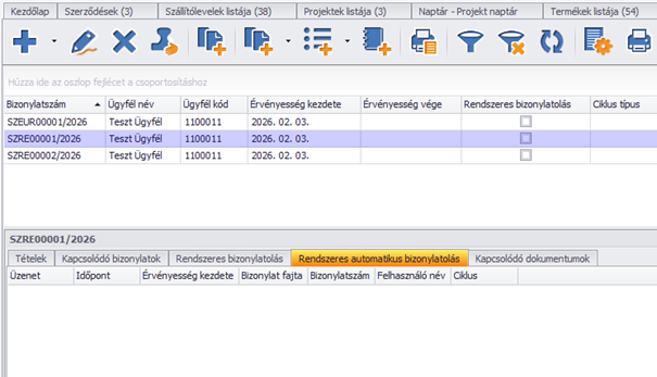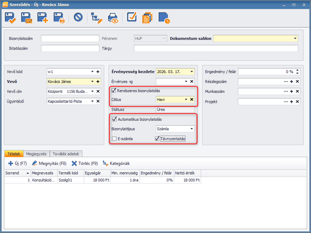 További paraméterezések is szükségesek a funkció használatához. Csak azokból a szerződésekből fog automatikusan számla készülni, amelyet rendszeres bizonylatolással készítettünk el és emellett megadtuk, hogy készüljön belőle számla vagy akár díjbekérő, illetve ezeket milyen módon szeretnénk ügyfelünknek eljuttatni.